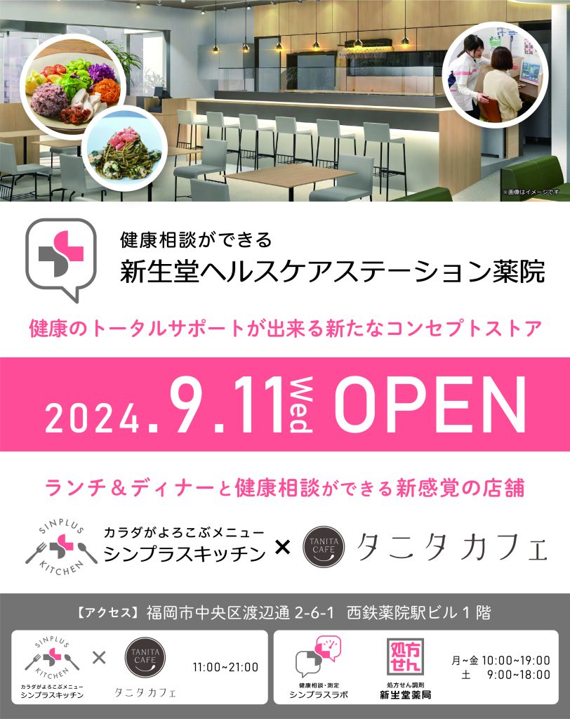 それを表現する新業態として、2024年9月11日(水)西鉄薬院駅の1階に「新生堂ヘルスケアステーション薬院」をオープンしました。健康相談・測定ができる「シンプラスラボ」、タニタカフェとコラボしたカラダがよろこぶメニューを揃えた「シンプラスキッチン」というレストラン、調剤薬局が併設した健康のトータルサポートが出来る新たなコンセプトストアです。このお店で、健康に関する新たな気づきを得てもらいたいと願っています。”